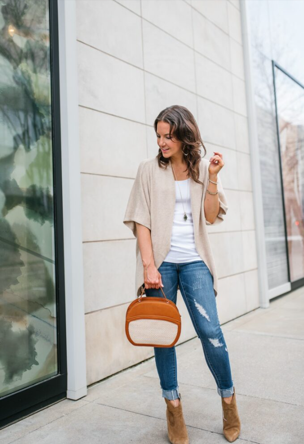 A beige cardigan with wide sleeves layers nicely over a white tank. Distressed jeans keep it casual, while cognac boots and a matching bag add fall tones. A small necklace completes the look.