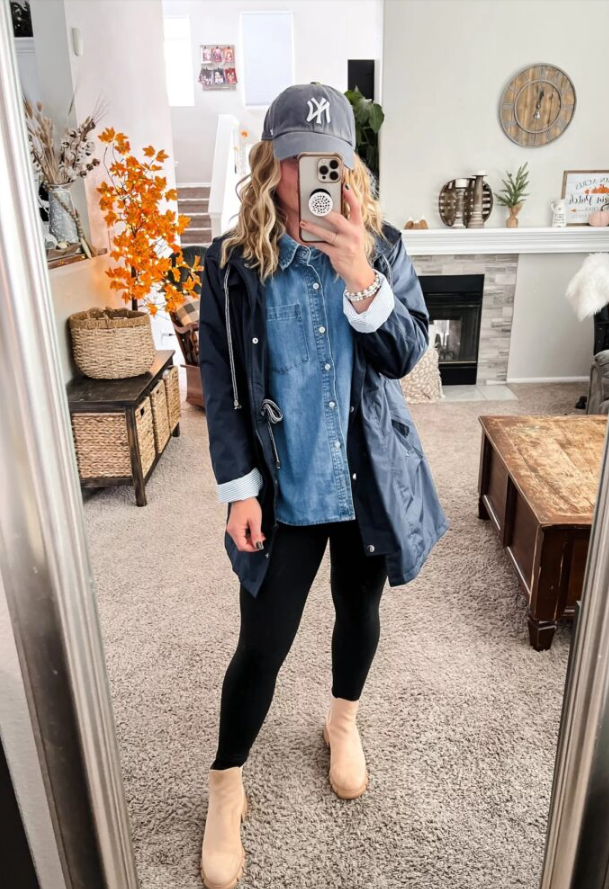 A denim shirt layered under a navy jacket creates depth. Black leggings balance the look, while neutral ankle boots and a baseball cap give it a laid-back weekend vibe.