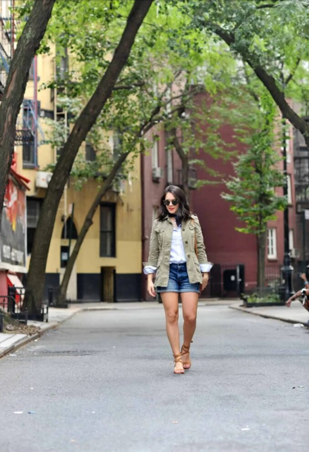 A khaki utility jacket over a crisp white shirt pairs well with denim shorts. Strappy sandals and sunglasses keep it fresh, making it great for days when the weather is unpredictable.