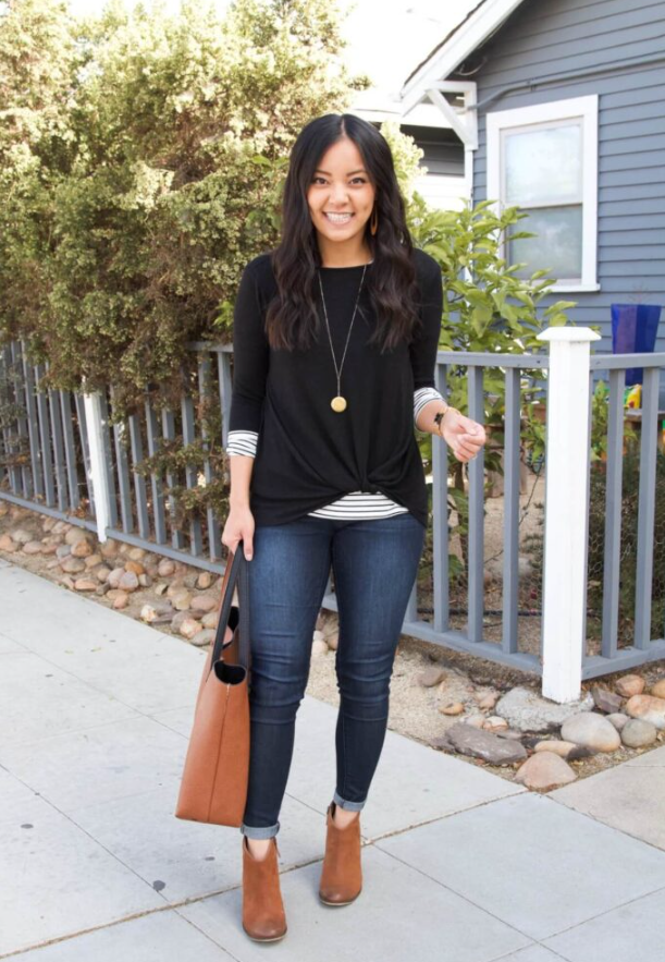 A black sweater tied at the front layers over a striped top. Slim-fit jeans and cognac boots make the look sharp, with a pendant necklace and tote adding small touches of style.