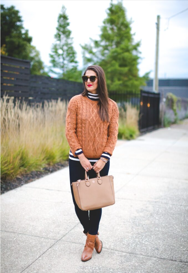 A chunky caramel sweater over a striped turtleneck adds warmth and pattern. Skinny jeans and cognac boots balance the outfit, while a tan bag and sunglasses make it chic but practical.