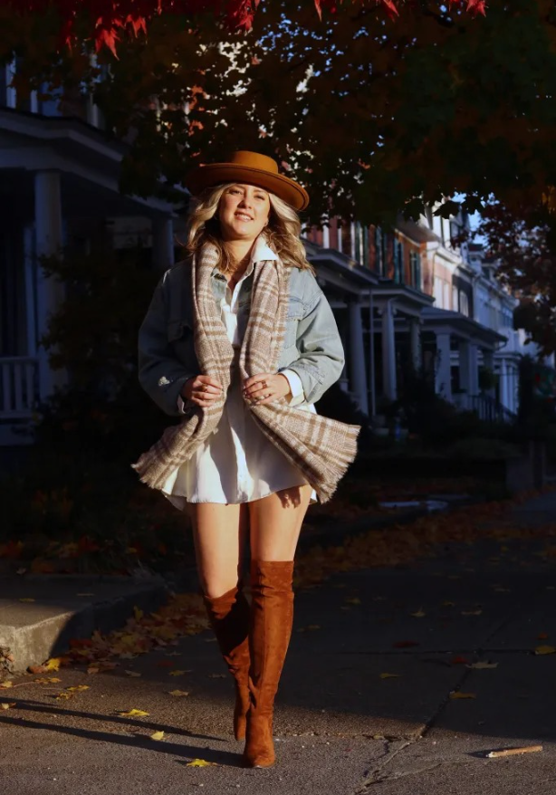 A denim jacket over a white shirt dress gets a cozy boost from a plaid scarf. Knee-high caramel boots and a wide-brimmed hat finish the look with a rustic touch.