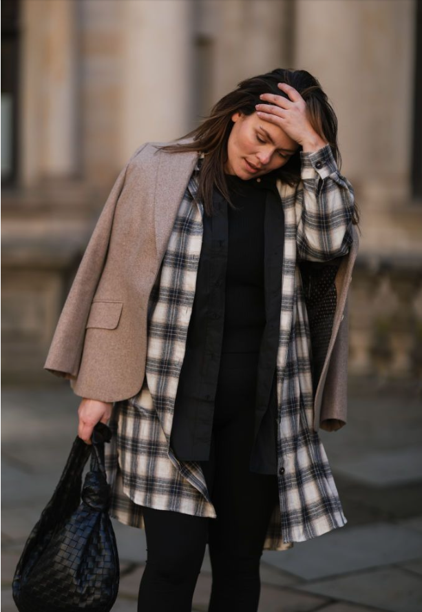 A plaid shirt paired with black basics gets a stylish lift from a camel coat. A woven leather tote adds texture, making the whole look classic and versatile.