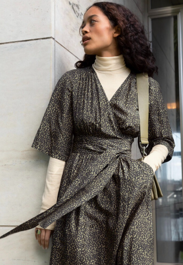 A leopard wrap dress layered over a cream turtleneck is bold yet cozy. A neutral bag ties the outfit together, making it playful but wearable for fall.