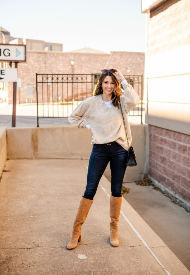 A beige oversized sweater layered over a white shirt pairs easily with skinny jeans. Tan knee-high boots, a small crossbody bag, and sunglasses keep it stylish and simple.