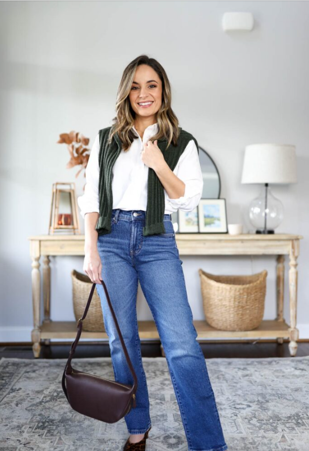 A green sweater vest over a white shirt creates a neat layered style. High-waisted jeans, a brown bag, and leopard flats make it casual but polished.