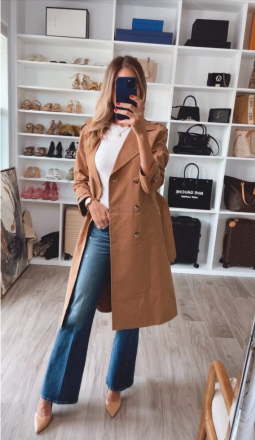 A camel coat instantly upgrades a white top and blue jeans. Neutral heels keep it sleek, while the mix of textures makes it timeless and easy.