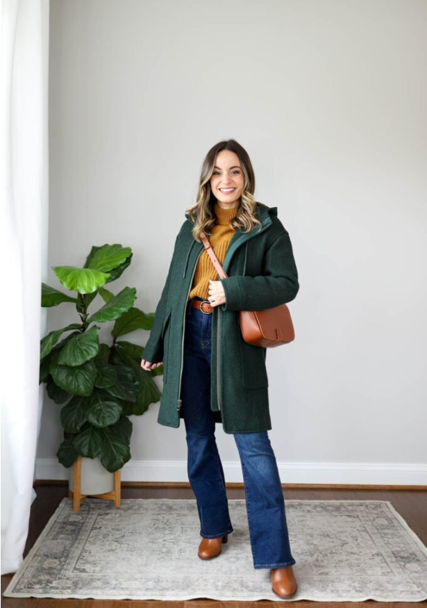 A green coat layered over a mustard turtleneck makes the colors pop. Blue jeans, brown boots, and a crossbody bag tie it into an earthy fall palette.