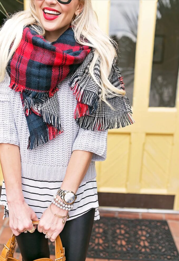 A red-and-black plaid scarf sits over a chunky gray knit, with a striped layer peeking through. Fitted pants, sunglasses, and a necklace keep it modern and cozy.