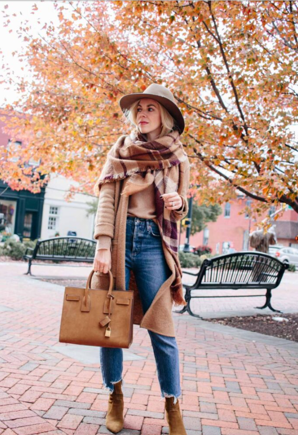 A camel coat over a cozy sweater pairs with distressed jeans. A plaid scarf, wide-brimmed hat, and tote bag make it classic and fall-ready.