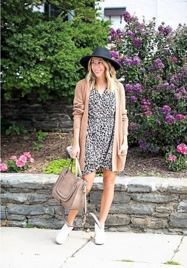 A camel cardigan adds warmth over a leopard dress. A black hat adds drama, a neutral tote keeps it grounded, and sneakers make it easy for daily wear.