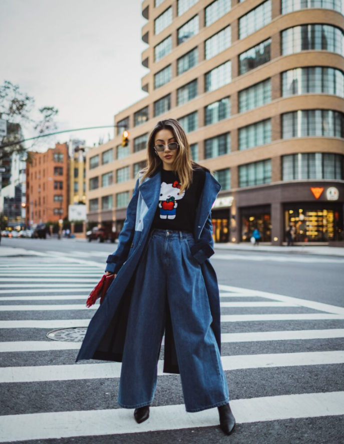 A long denim coat over wide-leg jeans makes a bold statement. A sweater with a cartoon detail breaks the denim, while ankle boots and sunglasses keep it stylish.