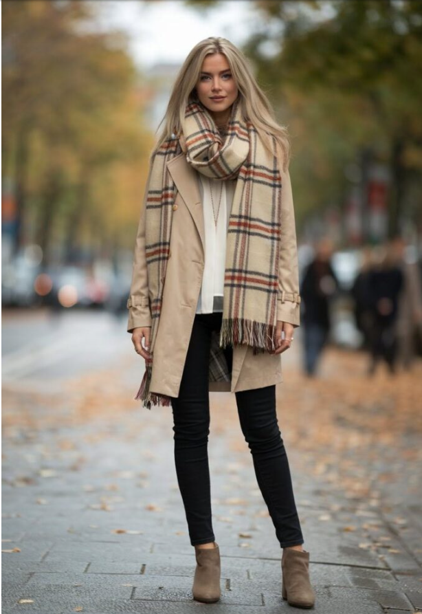 A beige trench layered over a white top and black jeans makes a clean, timeless base. A plaid scarf adds warmth and a fall print, with ankle boots to finish.