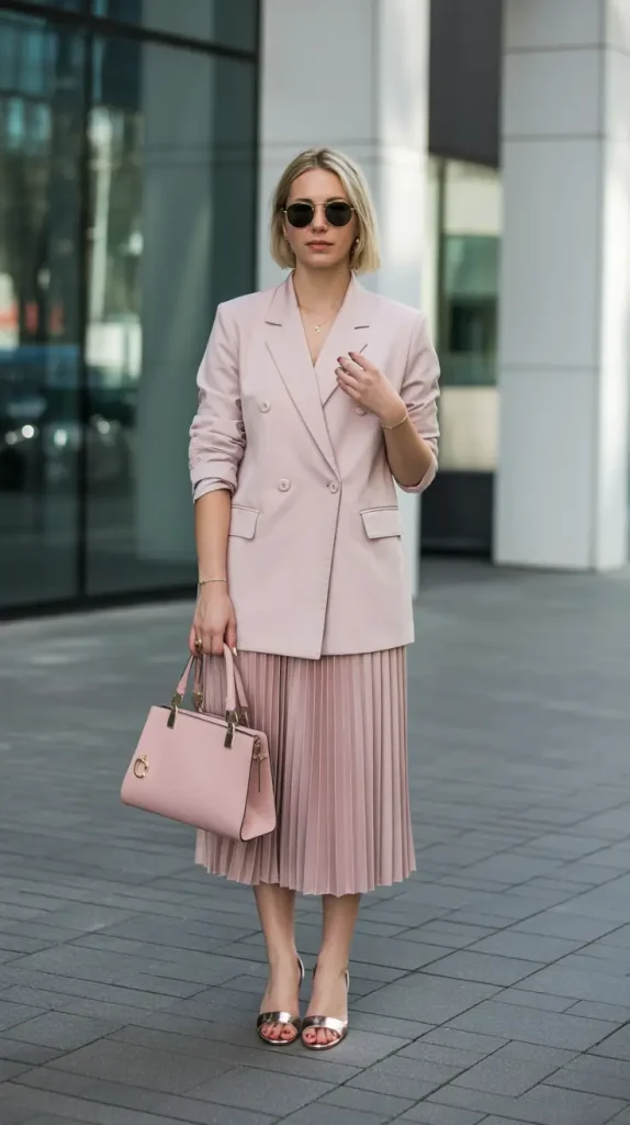 A tailored blazer instantly sharpens the look, while a pleated midi skirt adds movement. Neutral accessories keep everything cohesive, making the outfit suitable for varied city activities.