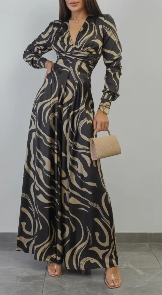A long dress elongates the body, while bold prints prevent heaviness. It’s easy to style and well-suited for dinners or events during travel.