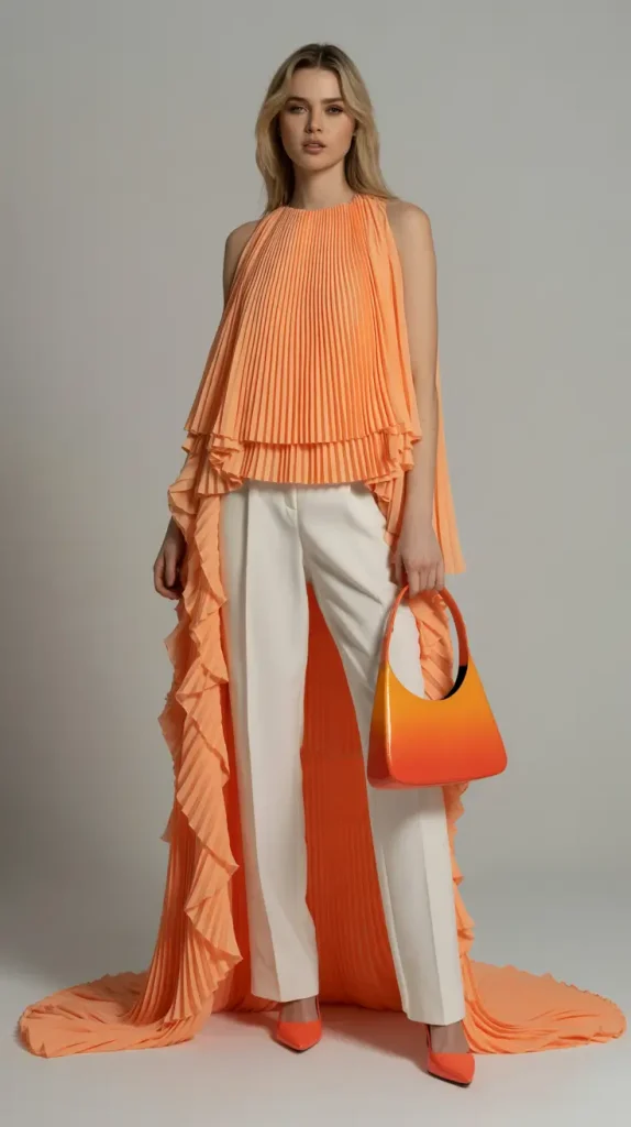 The pleated top introduces flow, balanced by clean trousers underneath. This outfit suits gallery visits and creative city days.