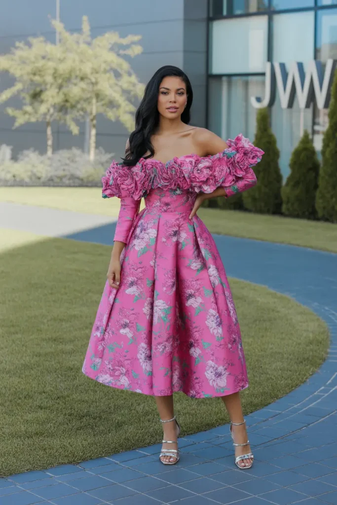Some holiday spring outfits are designed to mark memorable moments. This look stands out with bold floral texture, a structured shape, and an off-the-shoulder neckline that feels celebratory. It’s ideal for evenings that deserve extra attention.