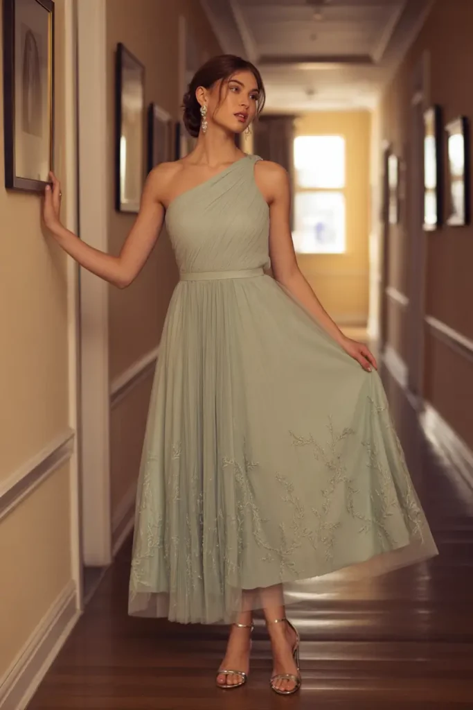 The one-shoulder design introduces asymmetry, while soft pleats create graceful movement. It’s ideal for evenings that call for refinement without fragility.