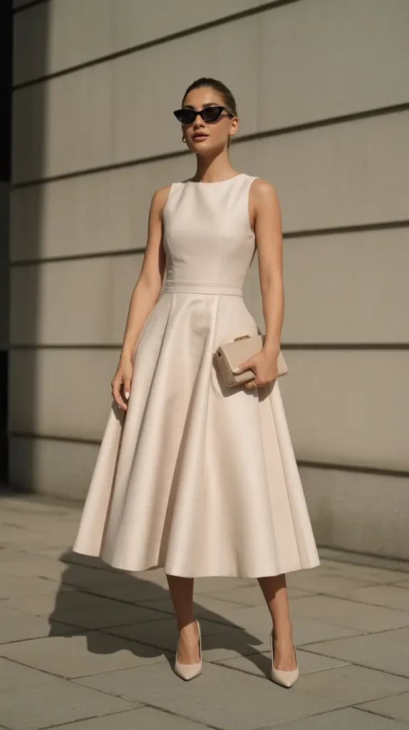 The balance comes from a shaped bodice paired with an easy hemline, removing the need for complicated layering. One dress, simple shoes, and a small bag are enough, which makes packing easier. It’s the kind of piece that suits slow mornings and long walks, especially in smaller European towns.