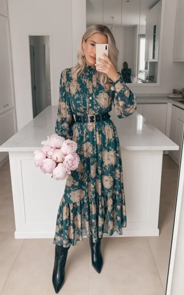 This outfit captures the feeling of spring gently settling in. A printed midi dress with long sleeves works well when the weather is undecided, offering both coverage and flow.
