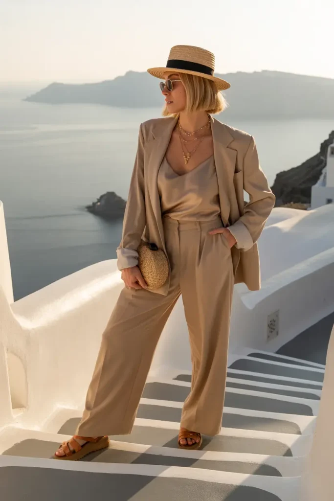 This look reflects warmth and ease, making it ideal for sun-filled destinations. Relaxed tailoring in neutral tones offers comfort while remaining polished.