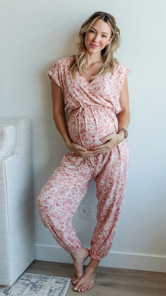 A maternity-friendly jumpsuit offers an all-in-one outfit that feels modern and easy to wear. Lightweight fabrics keep it suitable for summer, while the relaxed fit accommodates a growing bump. This option is convenient for days when minimal effort is desired without compromising style.