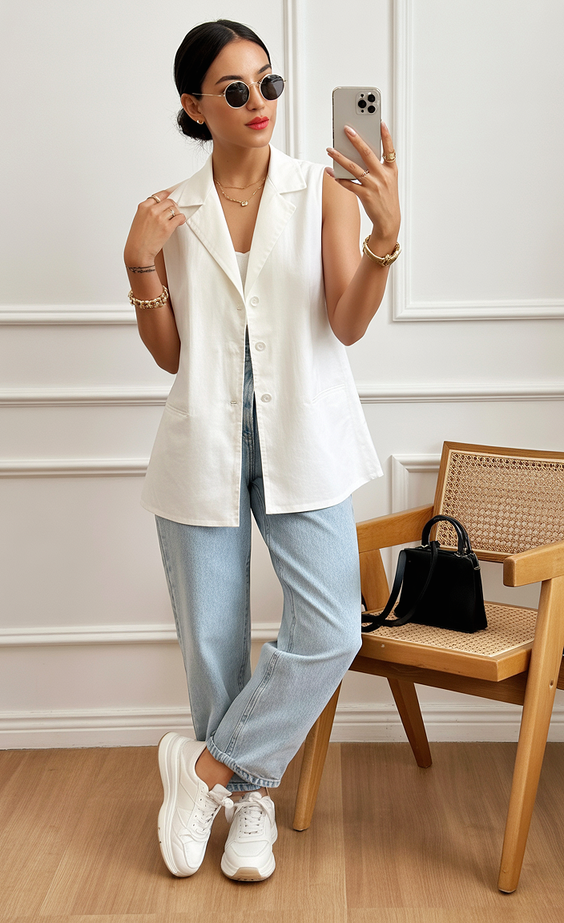 This look blends denim with tailoring to reflect modern business casual standards. A sleeveless vest adds structure, helping jeans feel appropriate for the workplace. The result is confident and current, especially for creative or casual offices. Cute Spring Work Outfits like this show how traditional boundaries continue to soften in 2026 workwear.