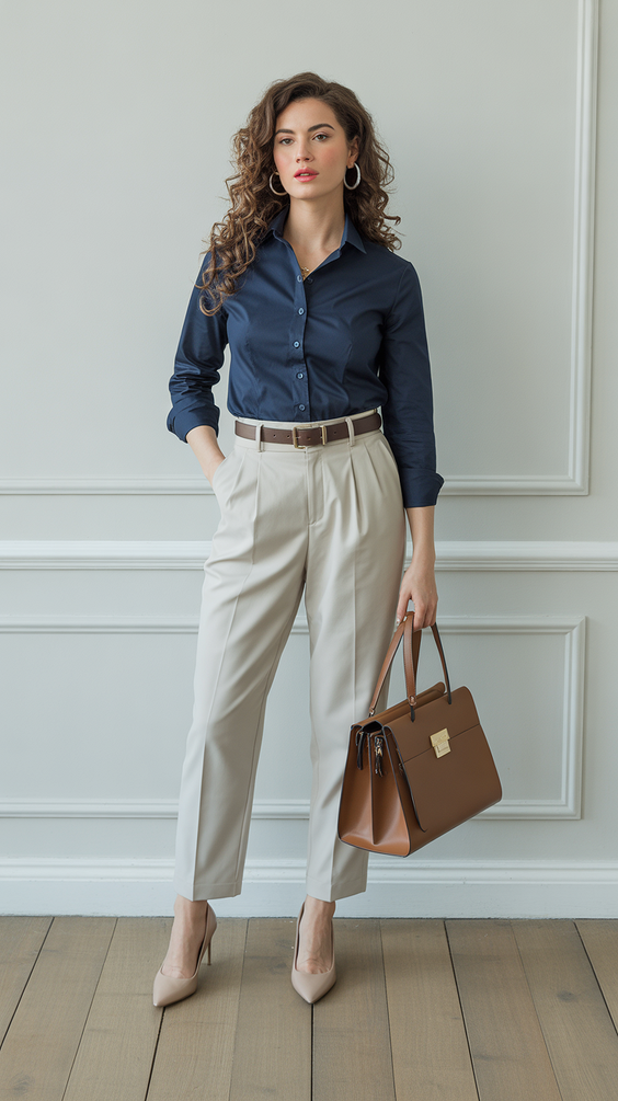 This look combines a dark button-down with lighter trousers for contrast and clarity. The structured shirt brings confidence, while softer tones keep the outfit spring-appropriate. Accessories remain minimal, reinforcing a calm and professional presence. Cute Spring Work Outfits like this are ideal for meetings and daily office wear where polish matters.