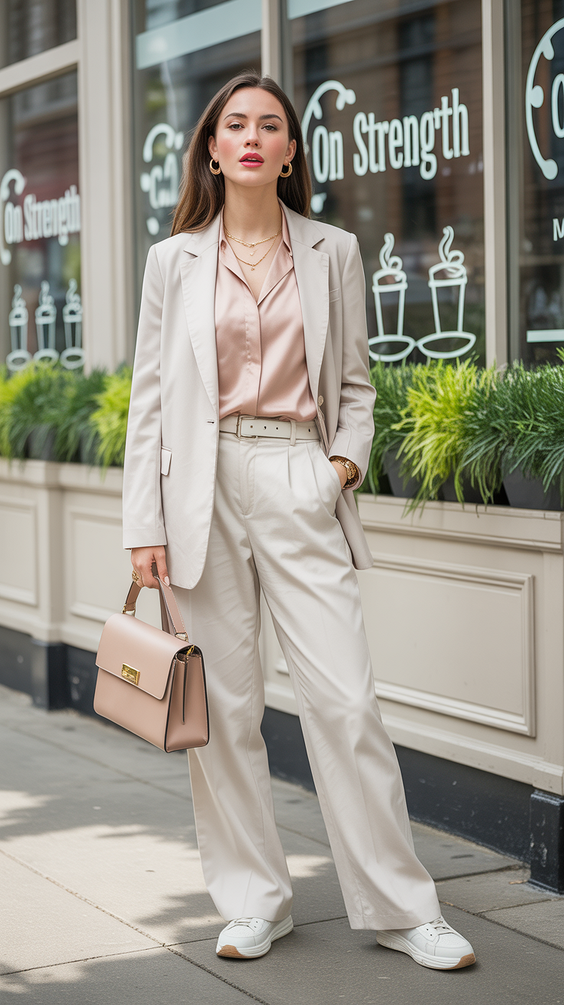 Soft beige tones bring freshness to early spring workwear. This outfit uses relaxed tailoring and fluid fabrics to create movement while maintaining polish. A silky blouse adds femininity, and neutral footwear keeps the look practical for busy office days. Cute Spring Work Outfits in lighter palettes feel uplifting after winter, offering a refined yet breathable option that works well for walking meetings and active schedules.