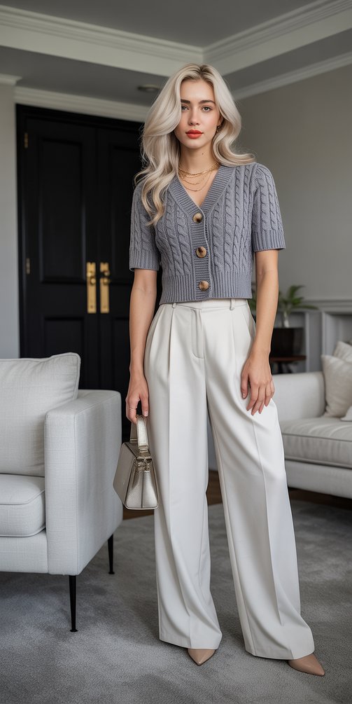 This outfit responds directly to lingering cold days in early spring. A short-sleeve knit cardigan paired with wide-leg trousers adds warmth while maintaining a professional outline. The knit texture softens the look, making it suitable for offices that lean toward comfort without abandoning structure. Cute Spring Work Outfits that include knitwear help bridge winter and spring seamlessly.