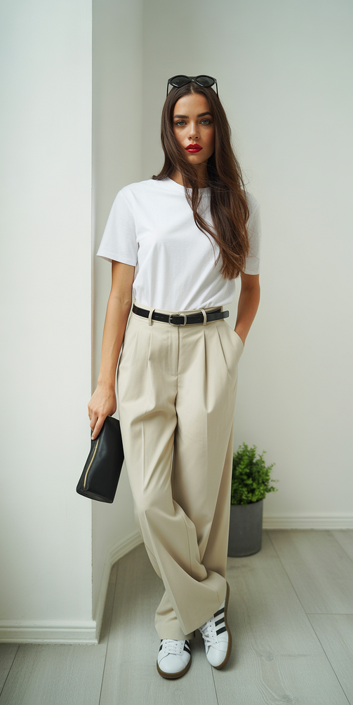 A white tee with tailored trousers proves that simple combinations can still feel intentional. Clean lines and neutral tones make this outfit versatile for modern offices, while sneakers add practicality for long days. Cute Spring Work Outfits built on elevated basics allow women to stay comfortable without sacrificing credibility or style.