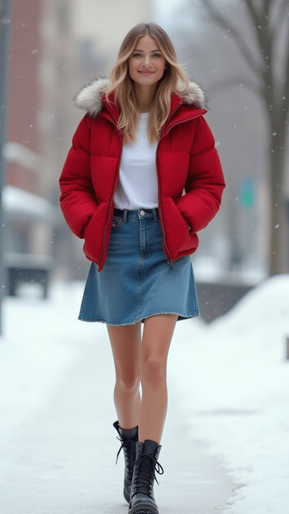 Denim skirts don’t have to be limited to warmer months. When paired with a puffer jacket, they become a fun and functional winter outfit. The jacket adds insulation, while the denim skirt keeps the look casual and versatile. This Cute Winter Skirt pairing is great for unpredictable weather and works well for everyday activities.
