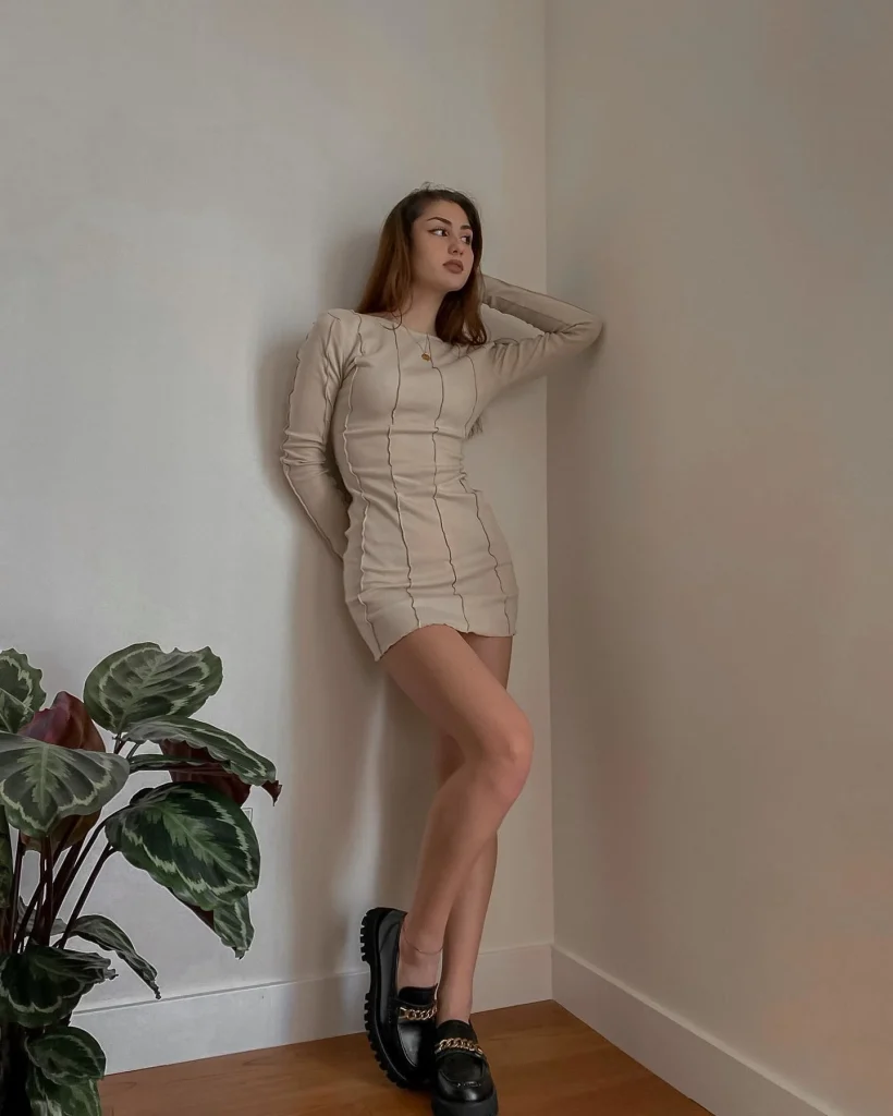 A nude bodycon mini dress with stitched paneling offers a sleek, sculpted look. Chunky black loafers with bold chain accents introduce contrast and edge, balancing the femininity of the dress and delivering a striking combination of minimalism and statement-making style.