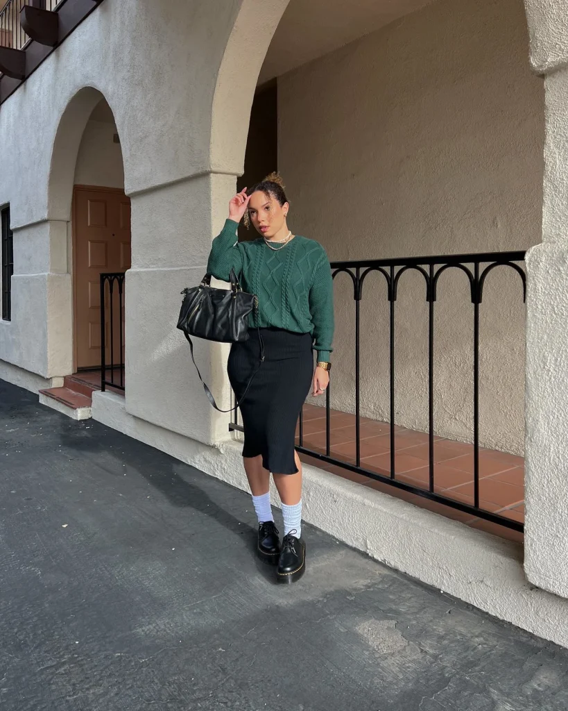 A deep green cable-knit sweater adds warmth and texture, tucked into a slit pencil skirt that subtly shows the leg. Platform loafers with white socks introduce a youthful vibe, while pearl accessories and a structured black bag elevate the look with refined, ladylike details.