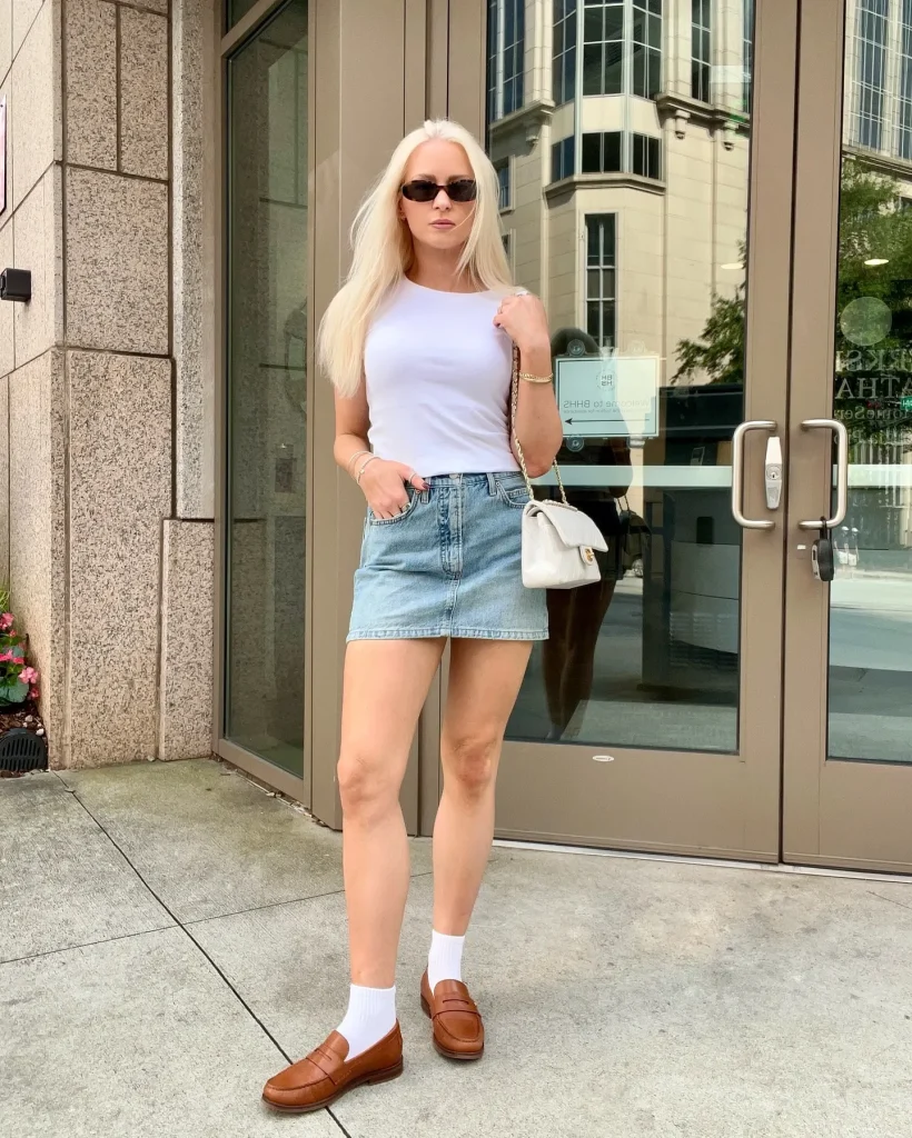 A fitted white tank top combined with a classic denim mini skirt creates a simple, summer-ready outfit. Brown loafers paired with white crew socks add a playful, retro touch, while a quilted white bag and sleek sunglasses maintain a polished, stylish finish.