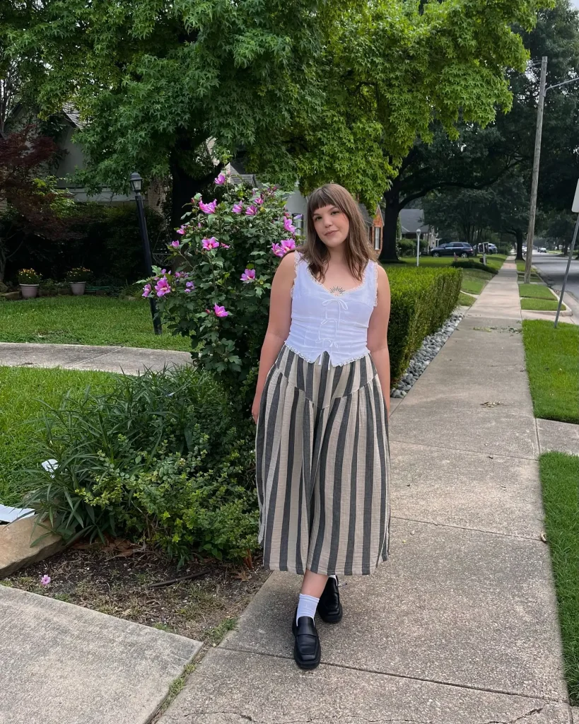 A white corset-style top adds a romantic, vintage charm, complemented by a striped midi skirt that brings movement and whimsy. Classic black loafers with white socks round out the ensemble, creating a modern cottagecore-inspired outfit that’s creative, soft, and effortlessly stylish.