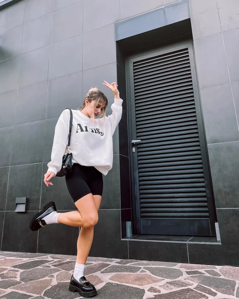 An oversized white graphic sweatshirt paired with black biker shorts captures effortless street-style energy. Chunky black platform loafers featuring chain details and white socks bring playful edge, and a small crossbody bag completes the sporty, on-the-go aesthetic.