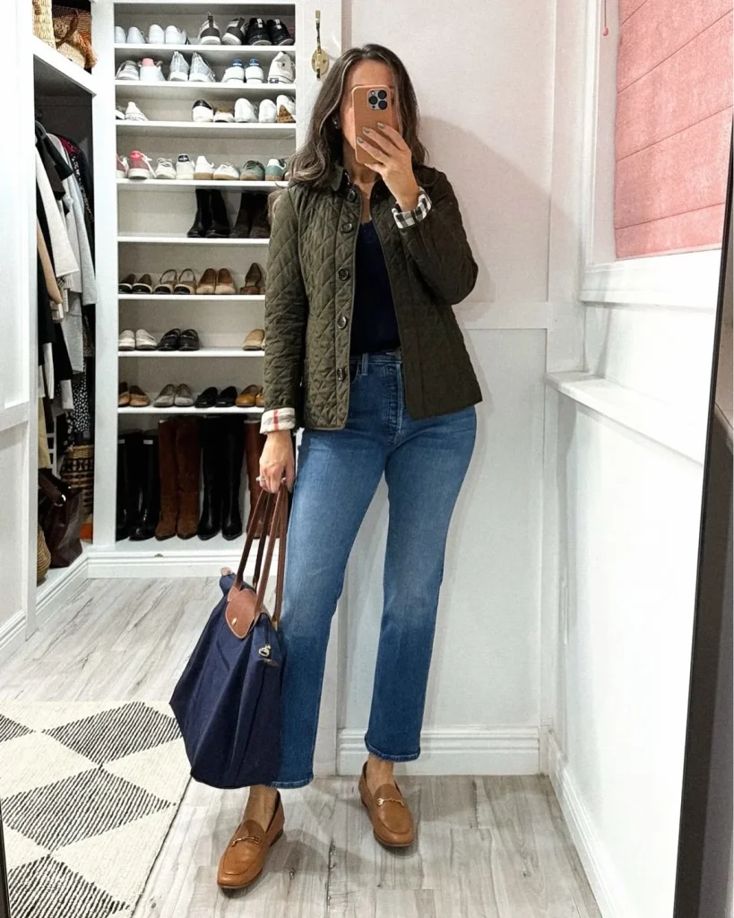 A quilted olive jacket offers rustic charm, layered over a dark top and straight-leg jeans. Tan loafers keep the outfit casual yet stylish, and a navy tote bag adds practicality while preserving a chic, everyday-ready look perfect for errands or casual outings.