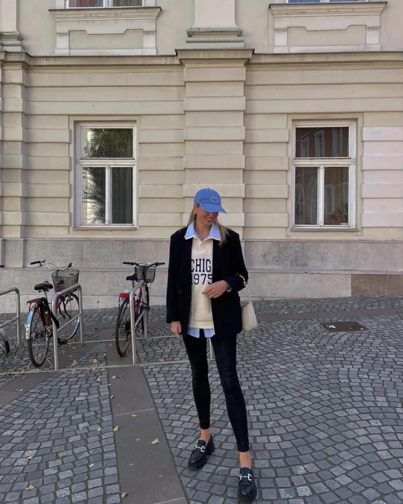 A collared shirt beneath a varsity-style sweatshirt creates collegiate-inspired layering, topped with a sleek black blazer for contrast. Black skinny jeans and classic loafers keep the silhouette clean, while a pastel blue cap and cream shoulder bag inject subtle, playful accents ideal for city walks or coffee dates.