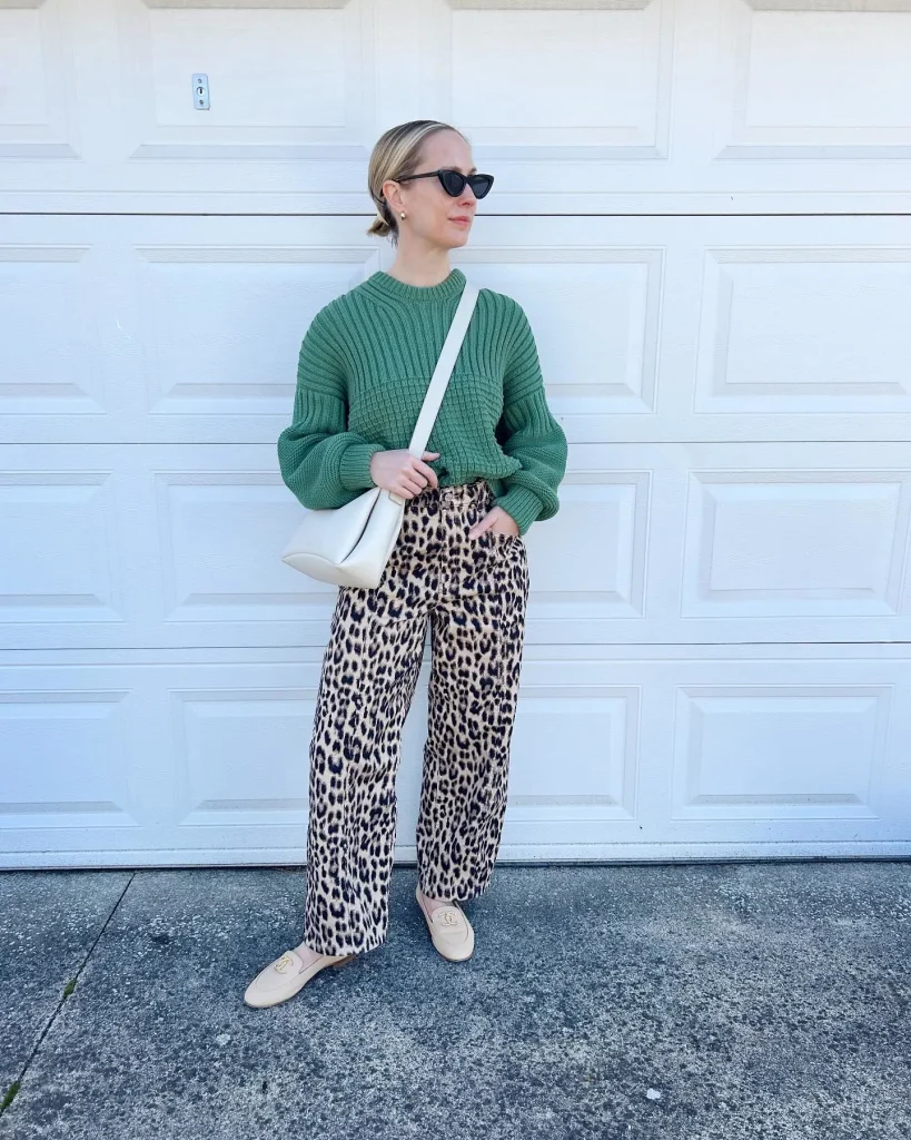 A soft green chunky knit introduces cozy texture and color, while wide-leg leopard pants add a playful, daring element. Cream loafers paired with a coordinating shoulder bag complete the outfit with a polished touch, creating a fun and stylish ensemble that’s both eye-catching and effortless.