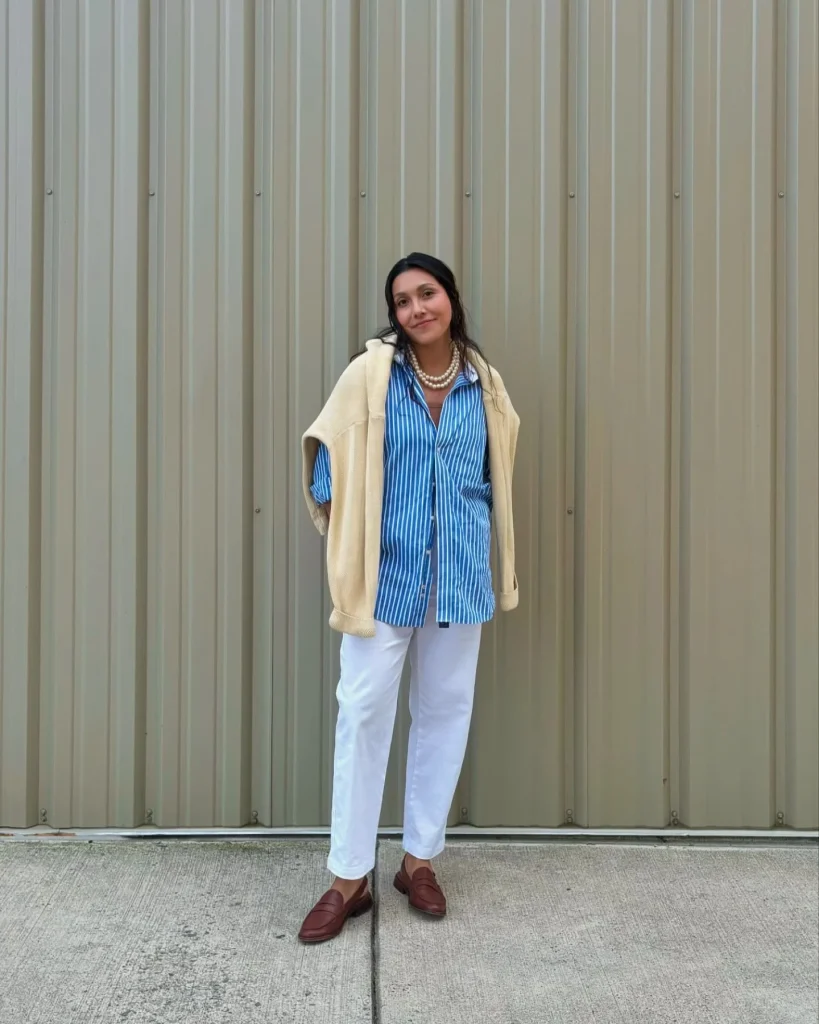 A relaxed blue-and-white striped shirt brings casual elegance, combined with crisp white pants as a clean foundation. Brown loafers add timeless appeal, while a soft cream sweater draped over the shoulders and layered pearls enhance the outfit with a polished, preppy finish.