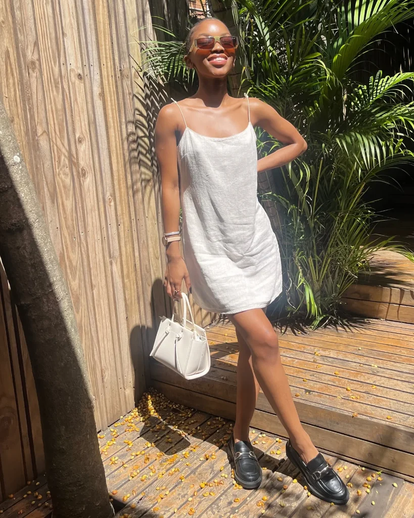 A lightweight white slip dress keeps the outfit minimal and breezy, while chunky black loafers provide a bold, edgy contrast. A structured white mini bag and oversized sunglasses tie the look together, balancing airy femininity with a touch of street-style flair.