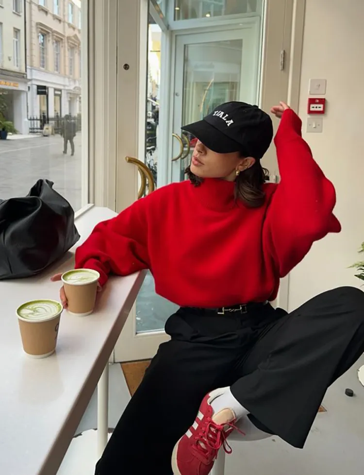 A red sweater or cardigan is perfect for those who want to feel extra festive. Keep the rest of your outfit minimal to maintain a low-key style. Pairing red with black slacks is a classic combination for Valentine’s Day, creating a chic, balanced, and approachable look.