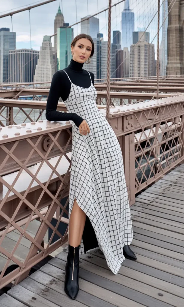 Layering a graphic dress over a fitted black base delivers urban style with structure. Strong lines and visual contrast create memorable yet practical spring outfits suitable for city life.