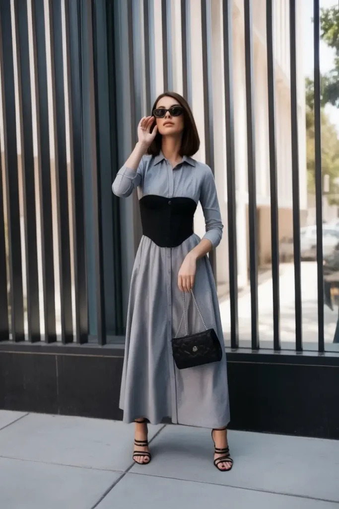 Pairing a classic shirt dress with a fitted corset layer introduces subtle structure into casual spring dressing. The shirt provides ease, while the corset adds definition and visual interest.