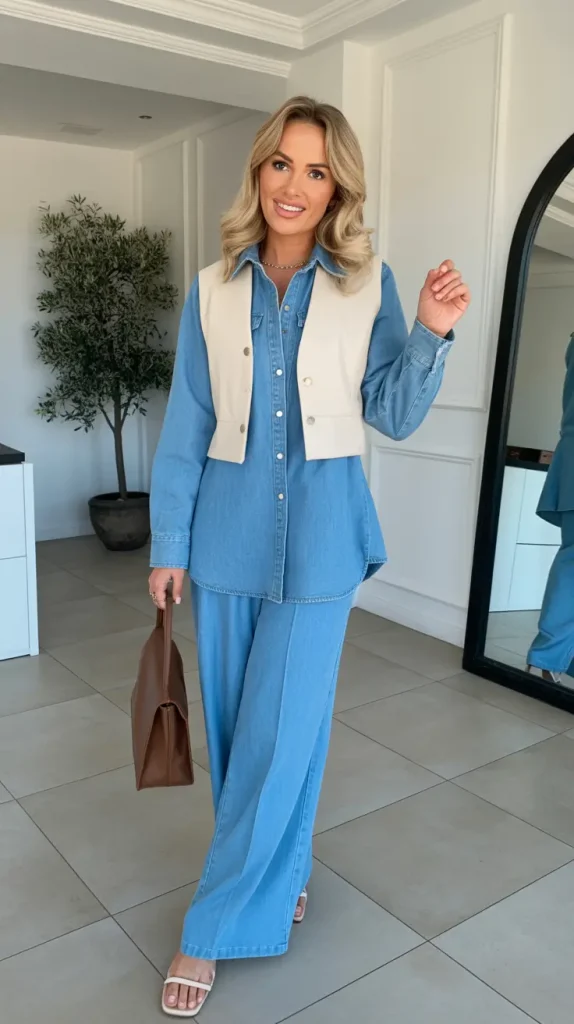 Denim layering evolves each spring. Pairing a relaxed denim shirt with wide-leg jeans and a cropped neutral vest creates a casual yet considered look. The balance of loose denim with structured accents results in effortless style suitable for errands, lunch outings, or casual meetings.