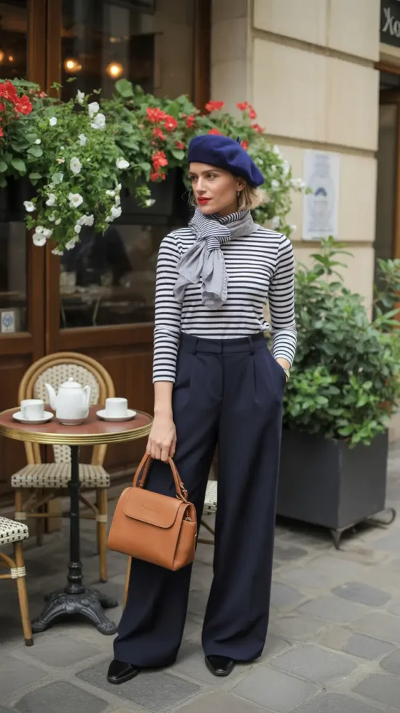 This outfit balances timeless stripes with tailored structure, creating a look that feels polished without being rigid. A striped top brings classic spring energy, while wide-leg navy trousers add shape and intention. Together, they form an Essential Spring Vacation outfit that works from casual mornings to culture-filled afternoons. Accessories like a silk scarf or structured trousers elevate the look while keeping it wearable and flattering for different body types. It’s an understated style that feels confident and adaptable, especially for city-focused trips.