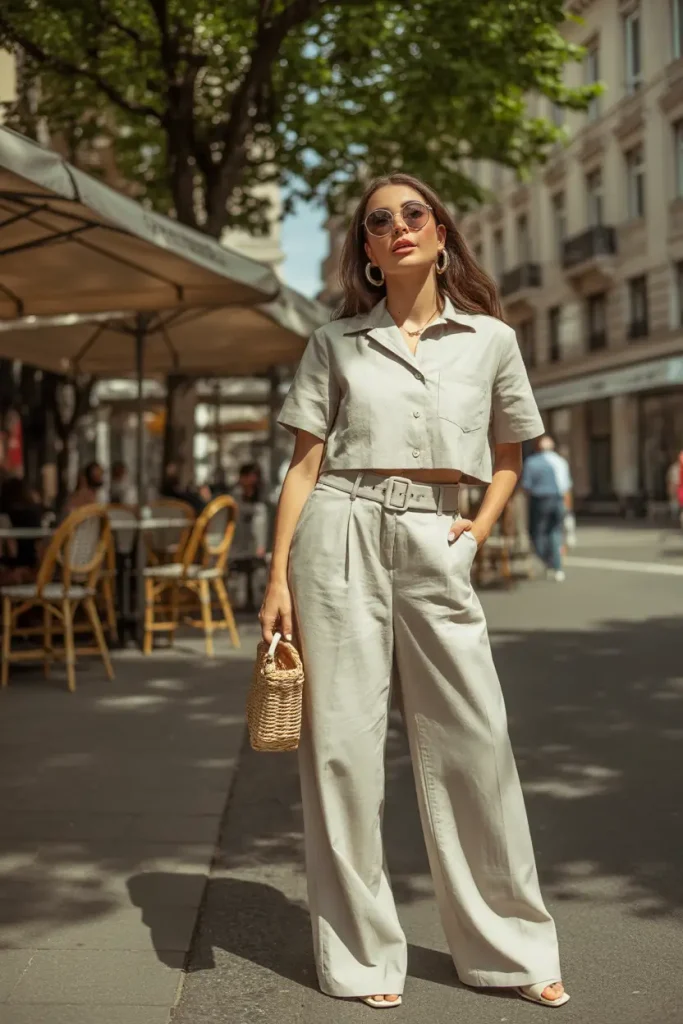 This outfit blends modern proportions with breathable fabrics, making it ideal for warm city days. A cropped shirt and high-waisted trousers feel current without being restrictive. The woven bag adds seasonal texture, reinforcing this as an Essential Spring Vacation look for walking, café stops, and casual sightseeing. It’s simple, polished, and easy to wear.