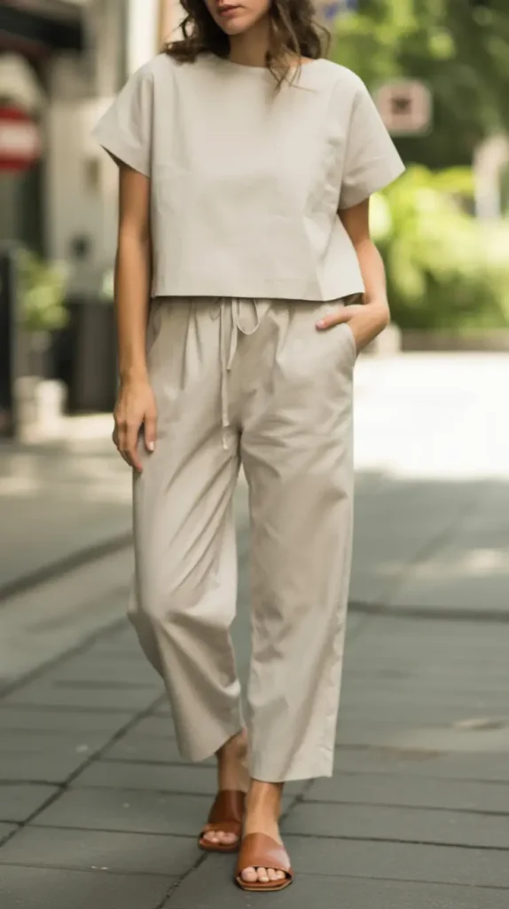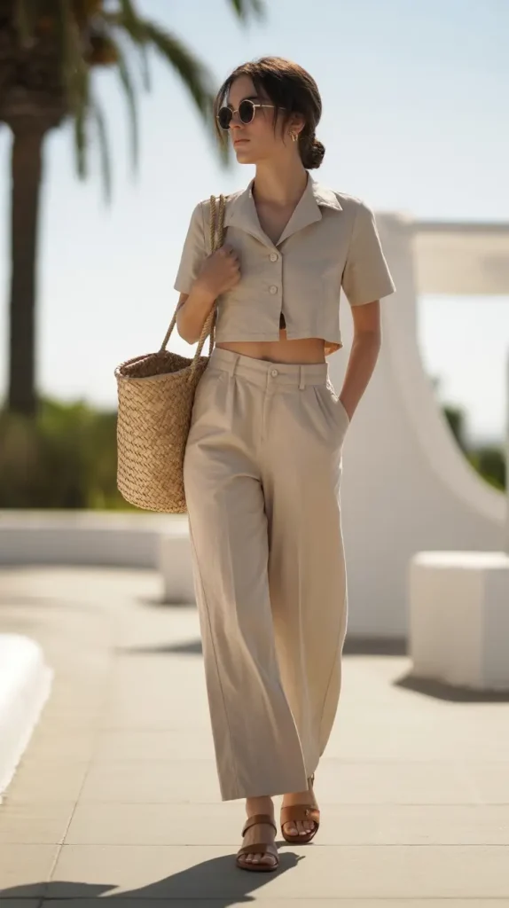 This minimalist pairing focuses on comfort through relaxed trousers and a cropped top. Neutral tones allow easy mixing and packing, while flat slides keep the look grounded. It’s an Essential Spring Vacation option for walking-heavy days where simplicity matters most.