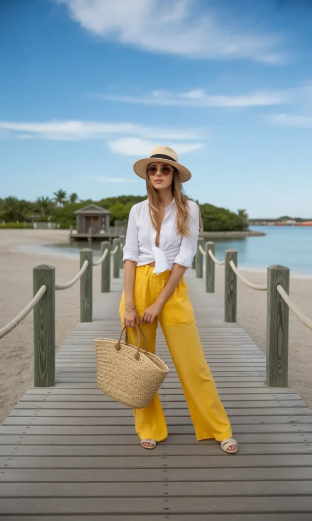 A crisp white shirt paired with yellow wide-leg trousers creates a confident, sun-ready combination. Breathable fabrics and relaxed shapes make it comfortable for warm destinations. This Essential Spring Vacation look leans into color while keeping the silhouette simple and wearable, ideal for beachside towns and boardwalk strolls.